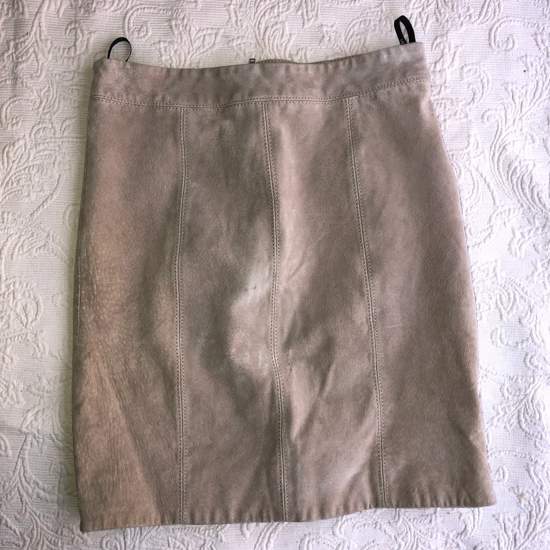Bardot Women's Beige Genuine Leather High-Rise Mini Pencil Skirt. Pull-on style with exposed zipper closure in the back. Seaming detail spaced out evenly throughout skirt. Fully lined. Fits true to size. Shell/Main: 100% Leather Lining: 95% Polyester | 5% Elastane *Measurements~ Size: 4 Waist measures: 13in Length: 17in Measurements are approximate. Good pre loved condition. Front of skirt has a black marking. Marking may come out in wash. Comes from a smoke-free house.