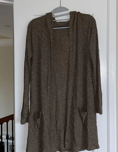Chocolate colored ribbed cardigan with textured feel and two pockets. Hooded. Excellent condition. A... Show more