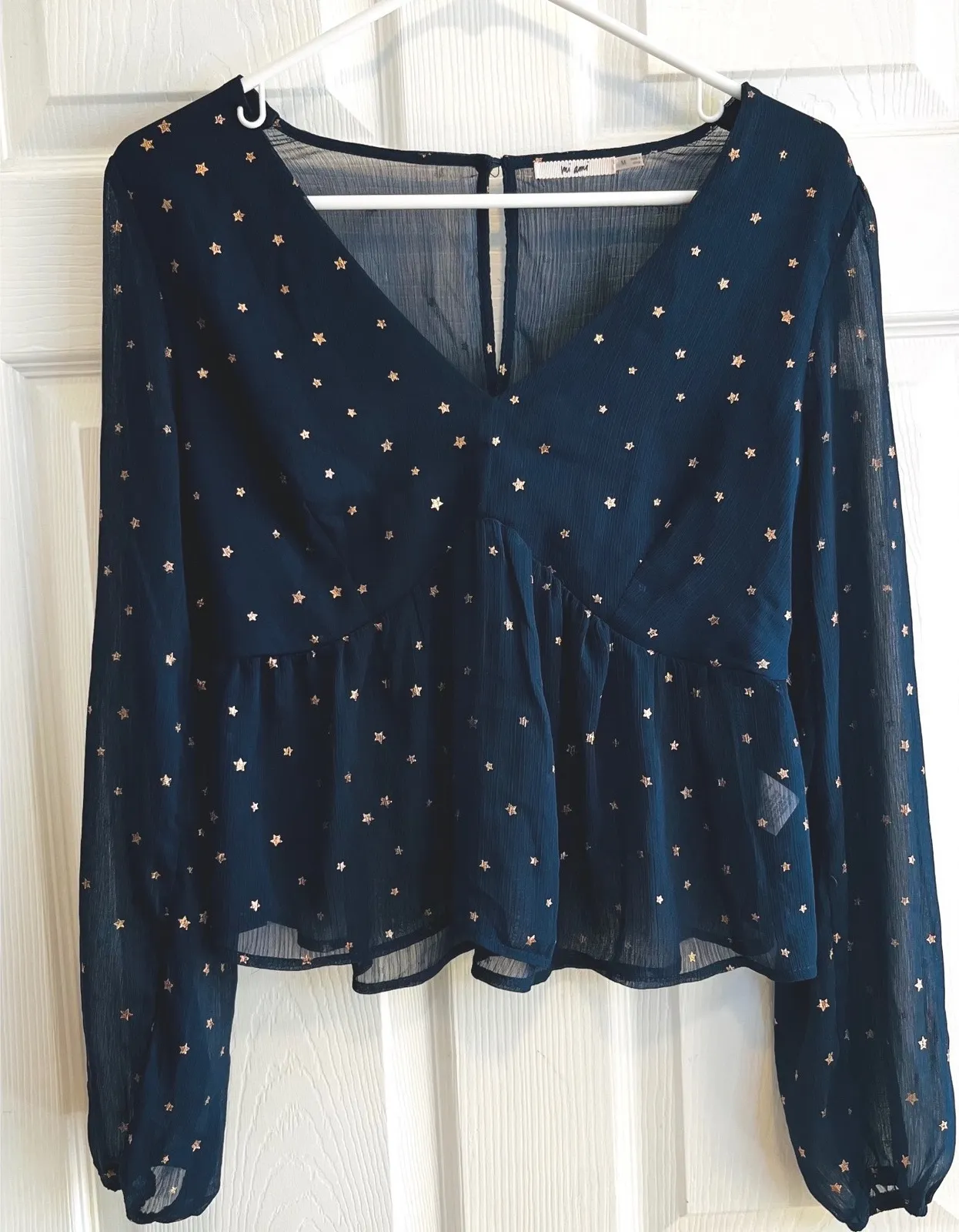 Like new! Its sheer construction offers an alluring peek-a-boo effect, while the flattering V-neckline and graceful peplum silhouette create a beautiful, feminine shape. The billowy long sleeves add a touch of romantic flair, making this top perfect for adding a touch of magic to your evening out or a special brunch. Type: Blouse Department: Women Style: Cropped Material: Polyester Neckline: V-Neck Sleeve Length: Long Sleeve Sleeve Type: Classic/Fitted Sleeve Pattern: Geometric Accents: Ruffle Theme: Stars Features: Sheer Fit: Regular Fabric Type: Mesh Occasion: Casual, Party/Cocktail Closure: Pullover Season: Spring, Summer, Fall Keywords: star print, sheer blouse, peplum top, V neck shirt, long sleeve, gold stars, navy blue, celestial, shimmer, evening wear, brunch outfit, feminine style, trendy top Thanks for Looking!