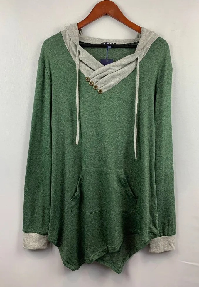 Elevate your casual wardrobe with this Miagooo hooded top. Designed for comfort and style, it features a unique buttoned neckline and practical front pocket. Ideal for layering or wearing solo, this top effortlessly transitions through the seasons. Its green and gray tones offer a chic, understated look. • Button accents on neckline • Front pocket for convenience • Soft, comfortable fabric • Stylish hooded design • Long sleeves for warmth Length: 45” Pit to Pit: 21” Sleeve: 27” Features: • All Season Size: Womens XL Condition: New With Tags