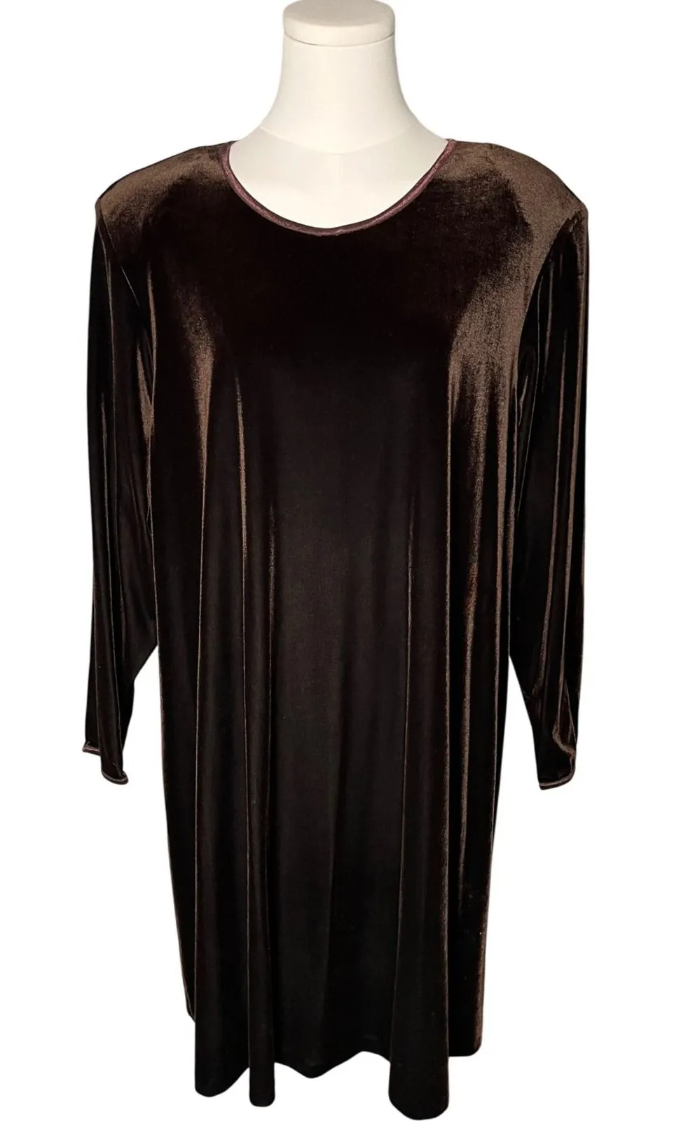Step into timeless elegance with this vintage 1990s Mica velvet dress, new with original tags (MSRP $168) and proudly made in the USA. Color: Rich chocolate brown Fabric: Soft stretch velvet (80% polyester, 15% spandex) Style: A-line silhouette with subtle swing flare, long sleeves, classic round neckline Size: Women's 1X (see flat measurements below) Condition: Vintage NWT — excellent, with original boutique tags attached A flattering plus-size vintage velvet dress, perfect for cocktail parties, holiday gatherings, or an elevated minimalist luxe wardrobe. Measurements (approx): Pit to pit: 23" Length: 37" Style-Core Stacking Vintage 90s glam Holiday luxe A-line party dress Quiet luxury Retro cocktail wear Minimalist luxe Made in USA vintage
