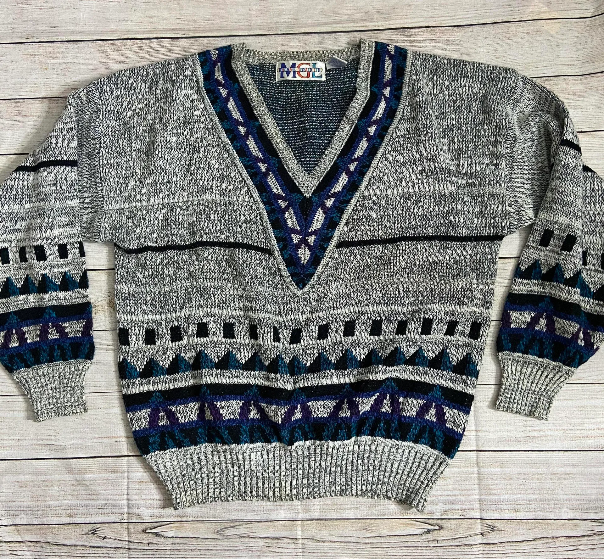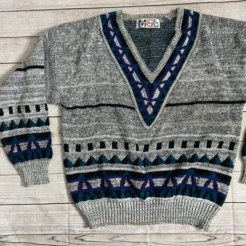 Vintage knit sweater by Michael Gerald Ltd in excellent vintage condition. No hole and a few very minor places of discoloration (really not noticeable — see pics). This heather gray v neck cardigan is just too cool to pass up. Truly unique. Size large. Can fit oversized.