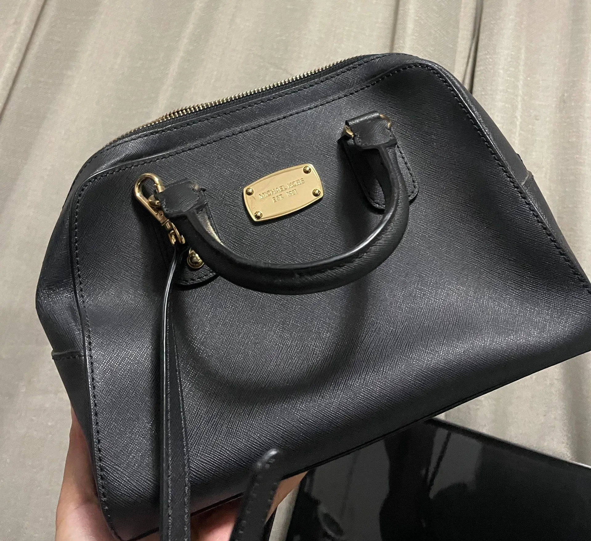 Color: black and gold Only flaw is minor scratches on the logo Straps and adjustable and detachable