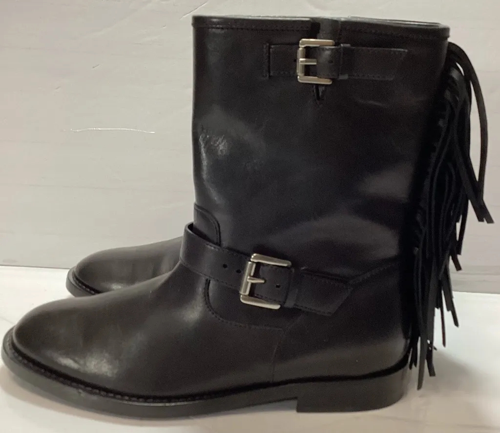 MICHAEL KORS COLLECTION Ingrid Fringe Leather Moto Boots Buckled leather boots with fringed trim at... Show more