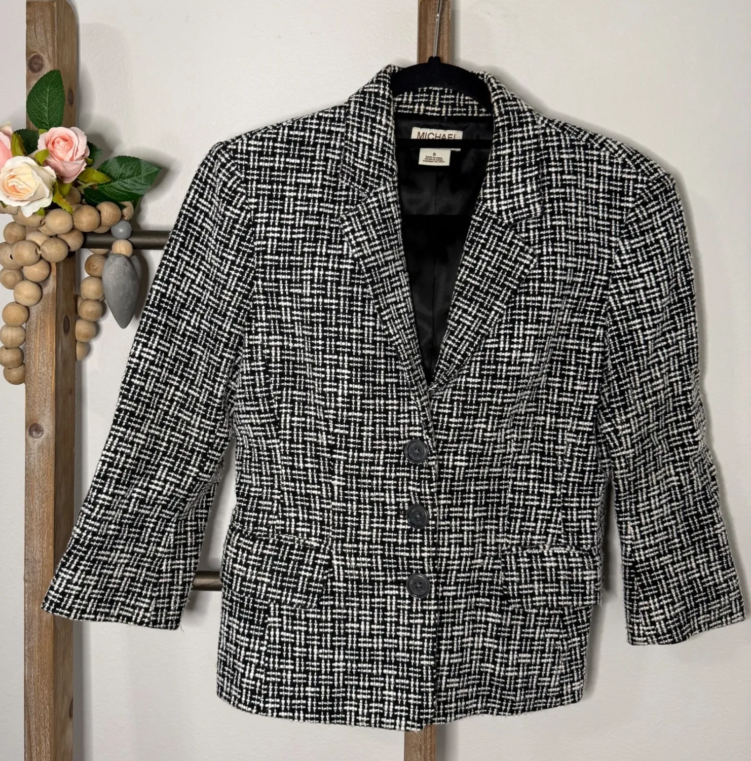 Michael Kors Black White Tweed Blazer Jacket Three Button Pocket Size 6 Shoulder Pads This is in gr... Show more