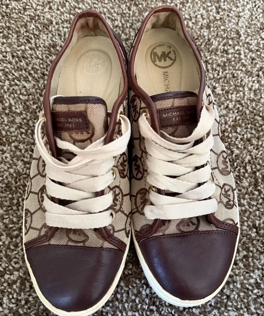 Stylish Michael Kors sneakers in brown and cream. Features logo pattern and lace-up design.