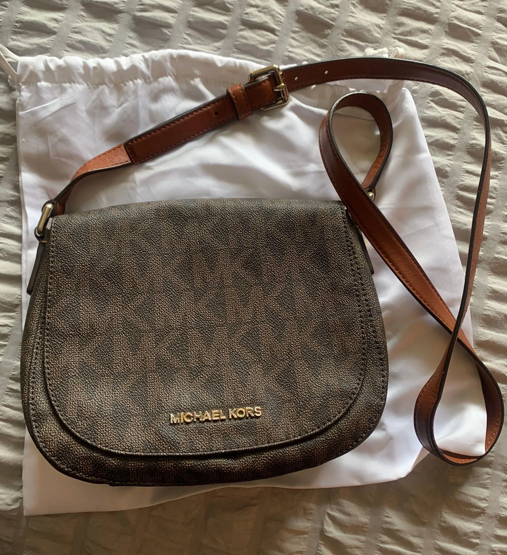 Brown Michael Kors crossbody bag. Button which closes the bag. Two compartments on the inside and on... Show more