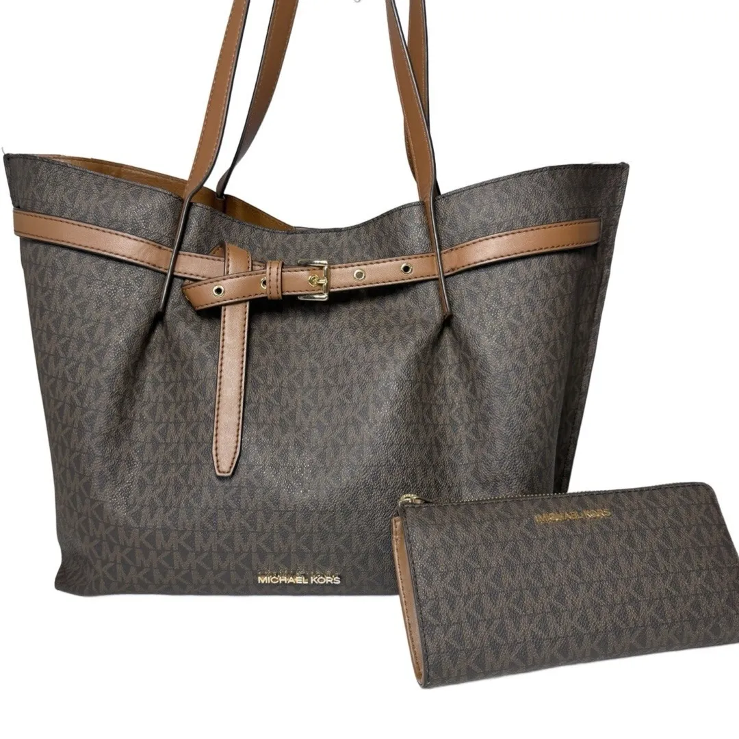Michael Kors Emilia Large Brown East West Bucket Tote Bag with Matching Zip Wallet. Wallet is in gre... Show more