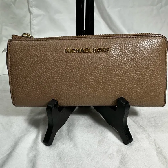 Elegant tan leather wallet by Michael Kors. Features a sleek design with gold zipper detailing.