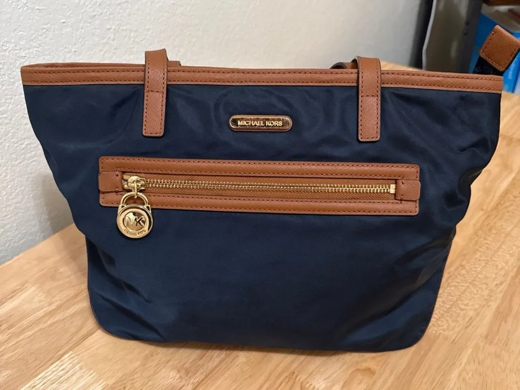 The Michael Kors Kempton Nylon Satchel Tote Purse Shoulder Bag in Navy and Brown is a stylish and pr... Show more