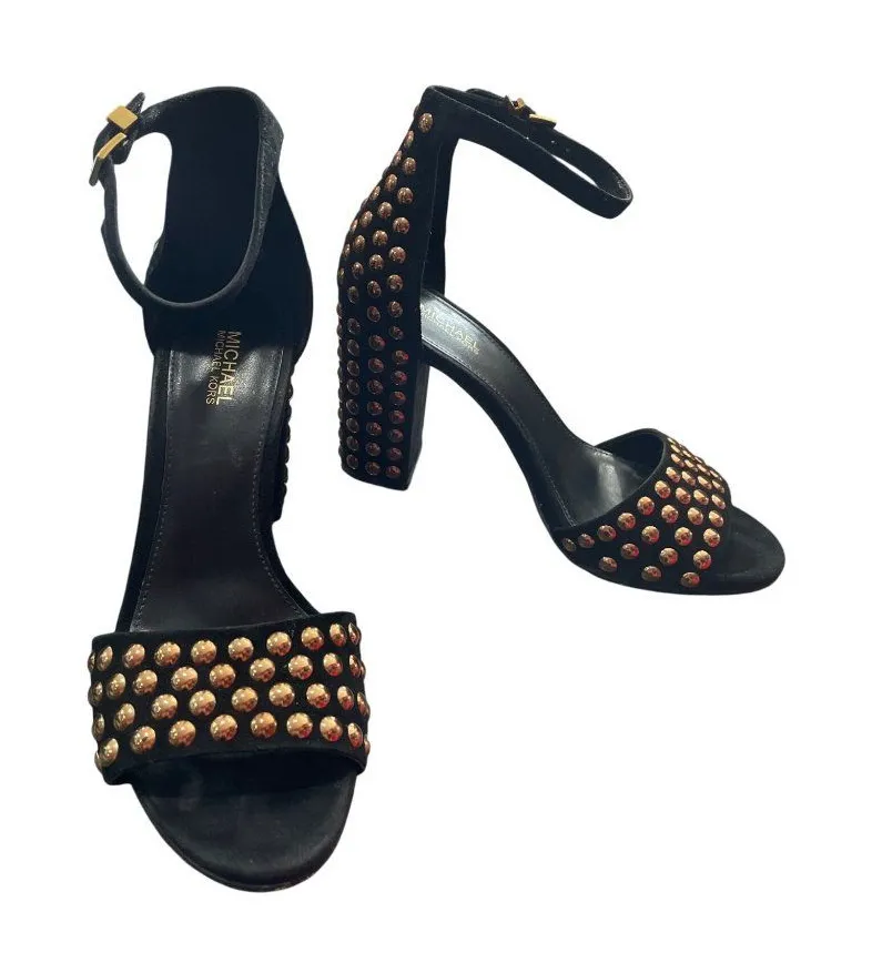 The Michael Kors Leela 4" block heels feature a black suede exterior adorned with gold studs, offeri... Show more