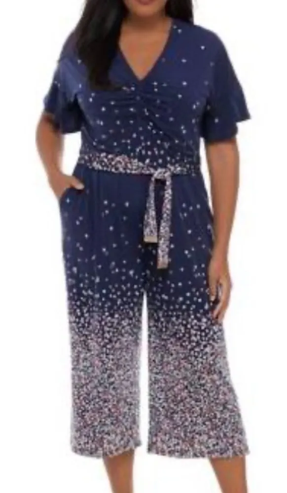 MICHAEL KORS Womens Navy Belted Floral Bell Sleeve V Neck Wide Leg Evening Jumpsuit Size 3X Approxim... Show more
