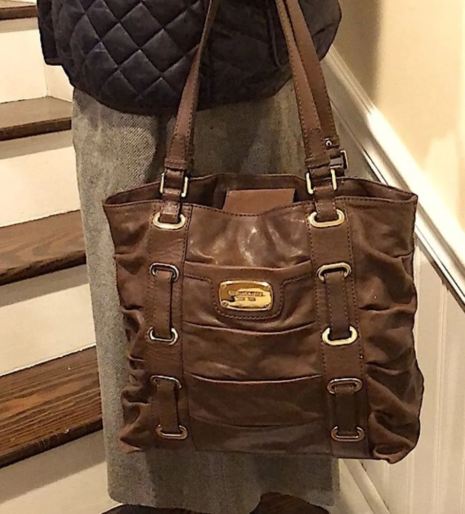 MICHAEL KORS Brown Leather Handbag Tote W Gold Accents MICHAEL KORS Leather HandBag Tote Color: Bro... Show more