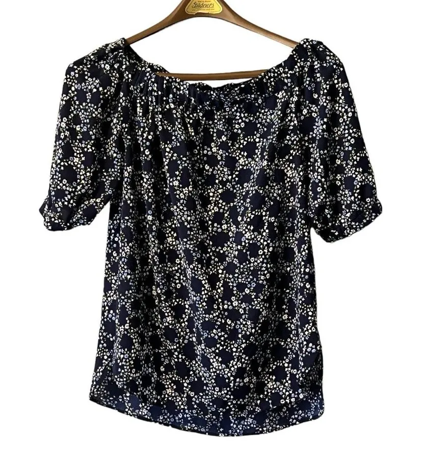 This top is preowned and in great condition! Michael Kors Blue Floral Print Off the Shoulder Bo... Show more