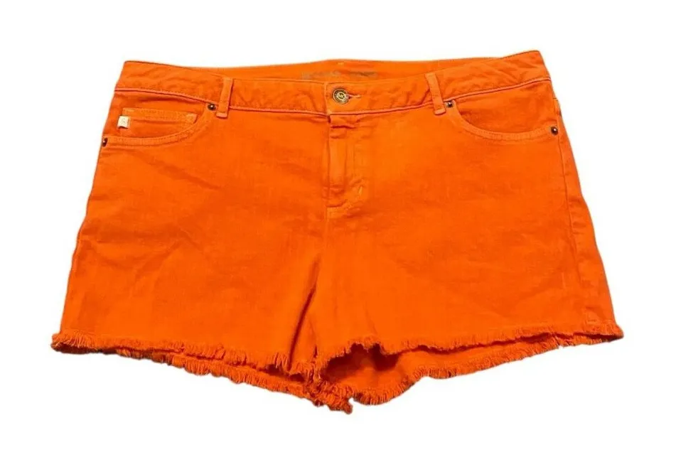 The product is a pair of Michael Kors women's denim shorts in a vibrant orange color, featuring a 3-... Show more