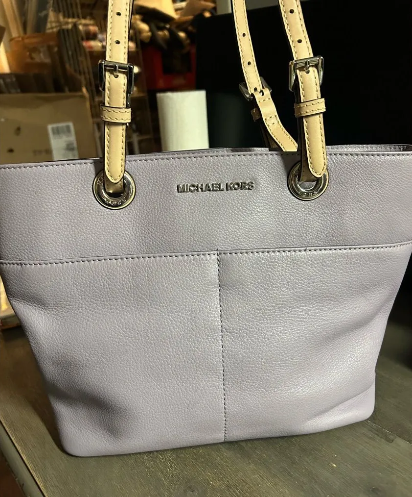 Lavender & Cream ‘Bedford’ shoulder bag from Michael Michael Kors. Made of canvas. Trimmed with leat... Show more