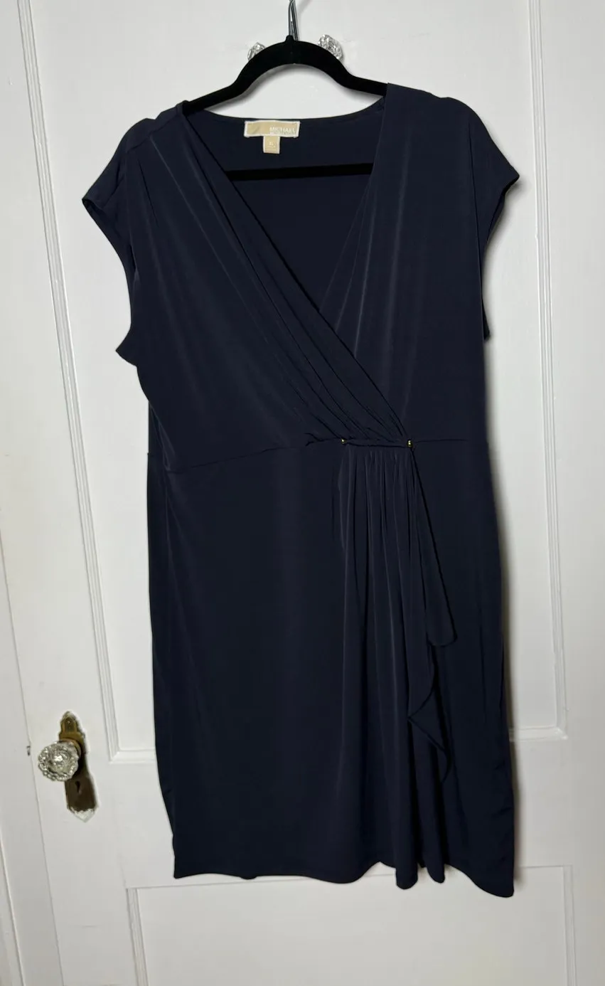 Excellent condition - no snags, holes, or stains Navy blue faux wrap dress Hits above the knee Cap sleeve Stretchy slinky fabric Flattering and pleated Smoke free pet friendly home All offers are welcome Ships quick Approximate measurements Pit to pit 24" Length 37" career, work, office, business, stretch, flattering, minimalist, closet staple, neutral