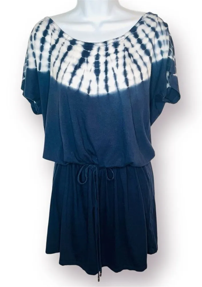 Michael Kors Navy White Tie-Dye Mini T-Shirt Dress Drawstring Large. Mini dress with tie-dye pattern at yoke. Drawstring waist. Cap sleeves. Boatneck. Casual dress that can be worn alone or used as a swimsuit coverup. Jersey cotton modal fabric. Gently used Good Preowned Condition.