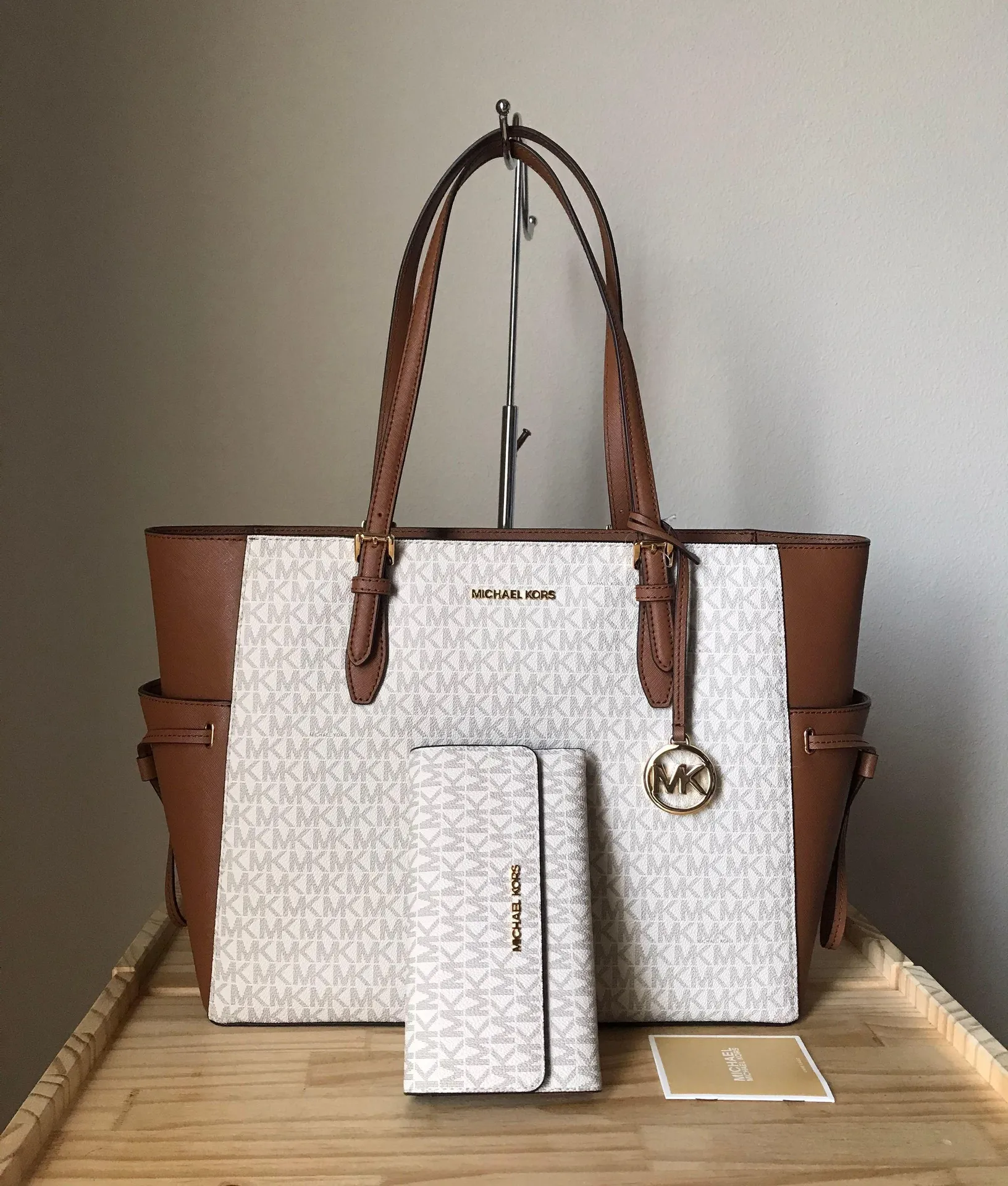 100% Authentic MK Gilly large drawstring travel tote Comes with a matching wallet Vanilla and gold... Show more