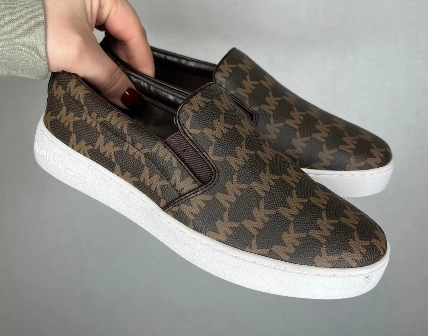 Michael Kors signature MK logo slip-on sneakers in brown. These stylish sneakers feature a classic a... Show more
