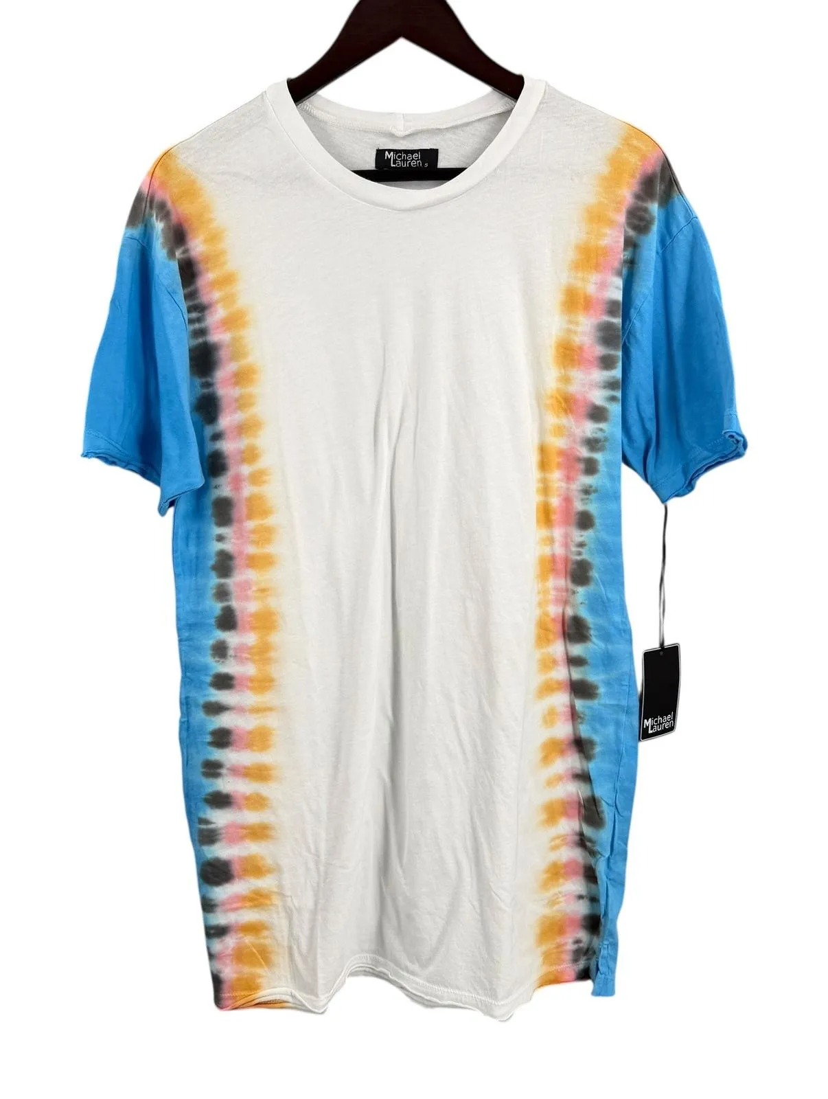 Michael Lauren Tie Dye T-Shirt Dress – Size Small (NWT) Vibrant and comfy, this Michael Lauren dress is made of 100% cotton and features colorful side tie dye panels with blue sleeves and a raw hem. Can be styled as a mini dress or an oversized T-shirt. Details: - Size: Small - Material: 100% Cotton - Armpit to Armpit: 21" - Length: 32" - Color: White with multicolor tie dye sides - Raw hem finish - New with tags Condition: Brand new, no flaws. Soft fabric and a boho-chic design perfect for casual wear or resort style. Keywords: tie dye, short sleeve, cotton, crew neck, graphic tee, casual, summer, beachwear, festival, oversized, relaxed fit, bold print, unique design