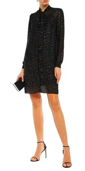 New with tags. Bow ties at neck. Long sleeves with button cuffs. Button front closure. Sheer top over black lining 100% polyester. Holiday, glam, designer, shimmery, edgy, modern, night out, sheer Chest: 17.5" Waist: 16" Length: 35"