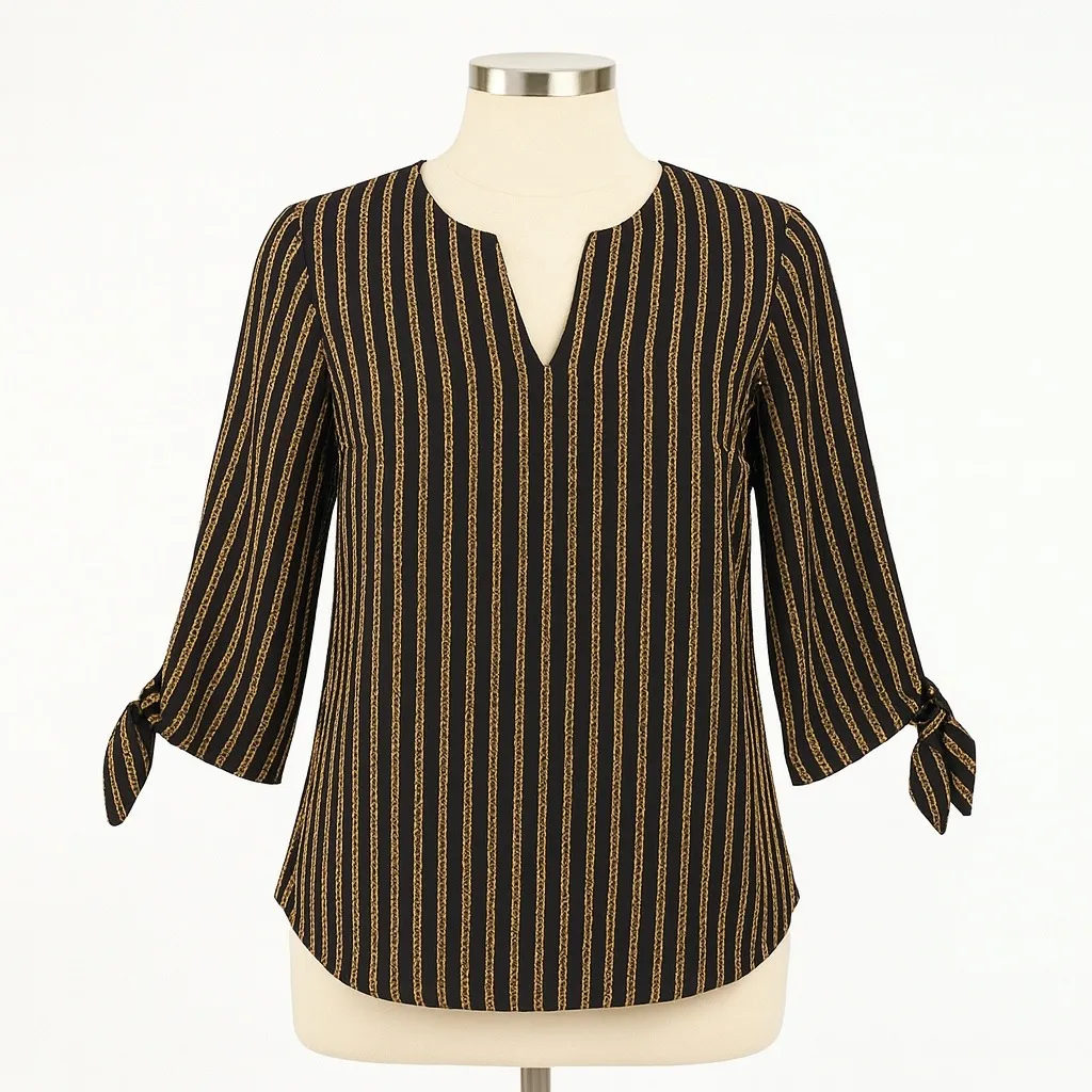 MICHAEL Michael Kors Blouse Womens L Black Gold Chain Print Casual Party Office Color: Black Yellow Type: Blouse Department: Women Material: Polyester, Elastane, Polyester Blend Neckline: V-Neck Sleeve Length: 3/4 Sleeve Pattern: Striped Features: Tie Sleeve, V-Neck Fit: Regular MICHAEL Michael Kors Blouse, Womens, Black, Gold, Chain Print, 3/4 Sleeve, Top, Designer, Elegant, Chic, Striped, Career, Casual Measurements are Approximate: Length 25" to 27" Armpit to Armpit 21" Pre-owned in excellent condition unless otherwise stated. Please see photos for measurements, condition and details. All items are shipped promptly.(7217)