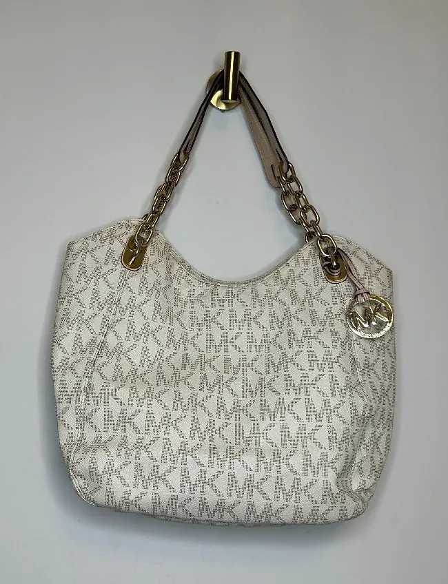 Pre-owned Width: 16" Height: 13" Strap drop: ~9" Color: Vanilla with gold hardware Brand: Michael Michael Kors Some wear on the chains, straps, and spots on the inside of the purse This bag is in great shape! Very roomy with magnetic closure