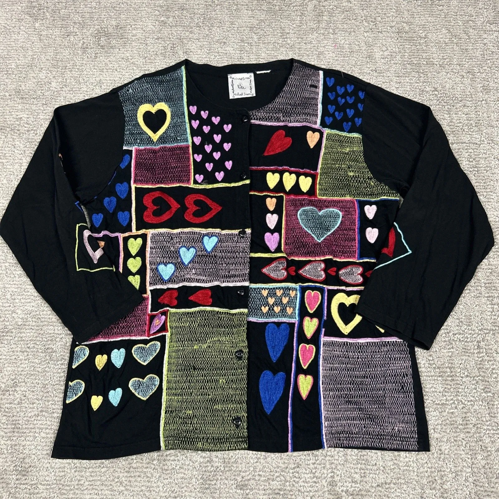 Michael Simon Cardigan Sweater Womens XL Black Valentines Day Embroidered Hearts - $69 - From kelli