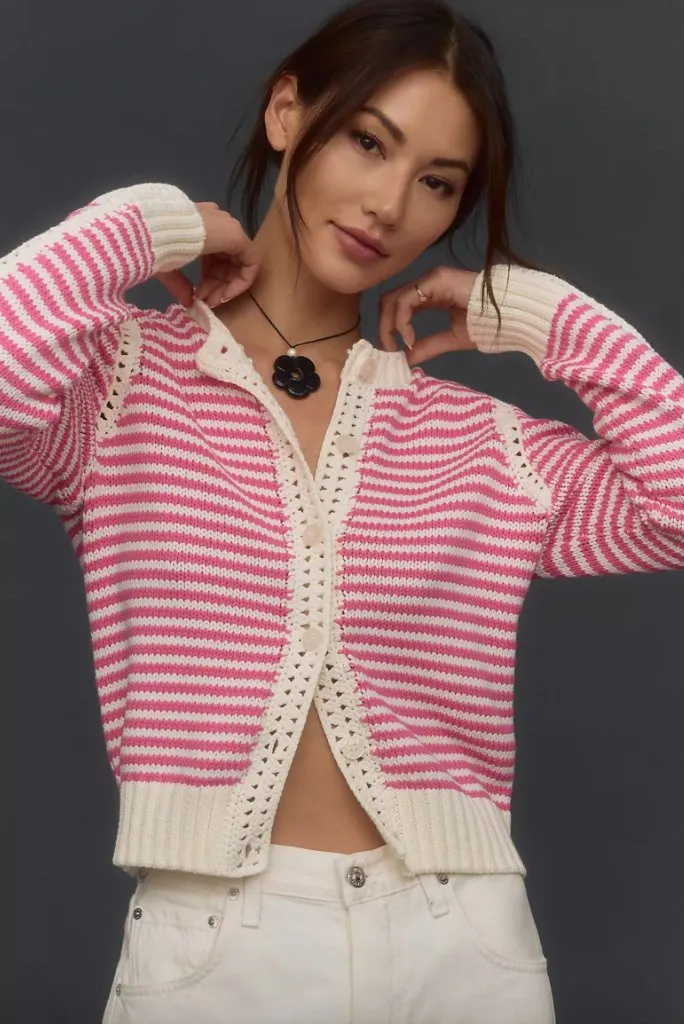 . This Adaline Sweater Cardigan is the perfect choice for an autumn wardrobe. Crafted from cotton crochet, the cozy material provides warmth and comfort in chillier weather while retaining a lightweight feel. Featuring a timeless crochet design, this beautiful piece will take you from season to season in style. Buttons Ribbed Cuff and Hem Fabric: 100% Cotton Pit to pit 23", length 23"