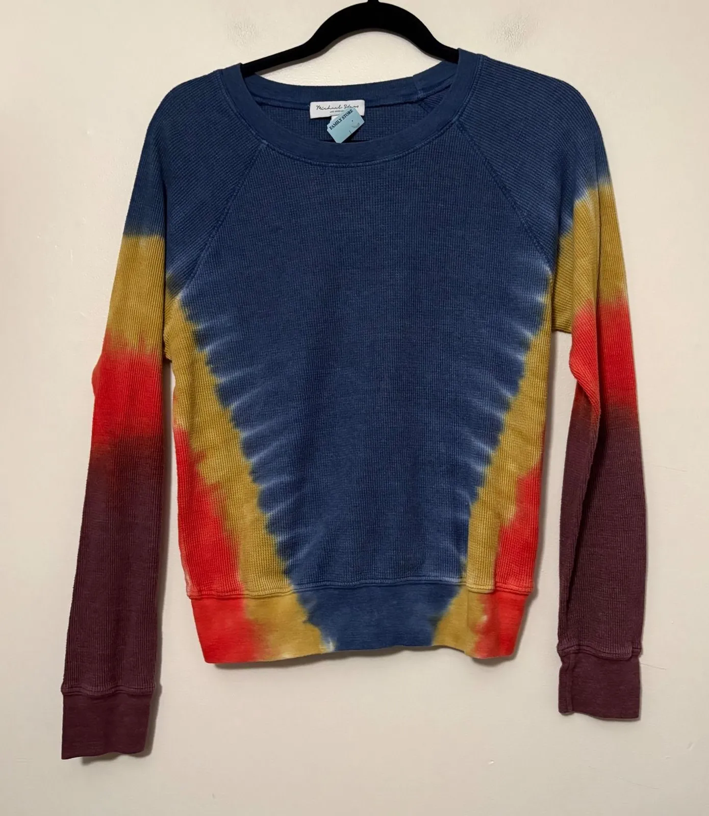 A vibrant tie-dye waffle knit crew neck sweatshirt by Michael Stars. This long-sleeve pullover features a bold chevron-style tie-dye pattern in shades of blue, yellow, red, and burgundy, with contrasting ribbed cuffs and hem. Perfect for casual outings, weekend relaxation, or layering during transitional weather. Style: Pullover Department: Women Material: Polyester, Cotton, Rayon Neckline: Crew Neck Theme: Rainbow Sleeve Length: Long Sleeve Type: Sweater Features: Thermal, Stretch, Breathable Pattern: Geometric Sleeve Type: Raglan Sleeve Fabric Type: Knit Knit Style: Waffle-Knit Season: Fall, Spring Fit: Relaxed Keywords: Michael Stars, sweatshirt, waffle knit, crew neck, tie dye, long sleeve, pullover, chevron, boho, casual, loungewear, streetwear, unique, vibrant
