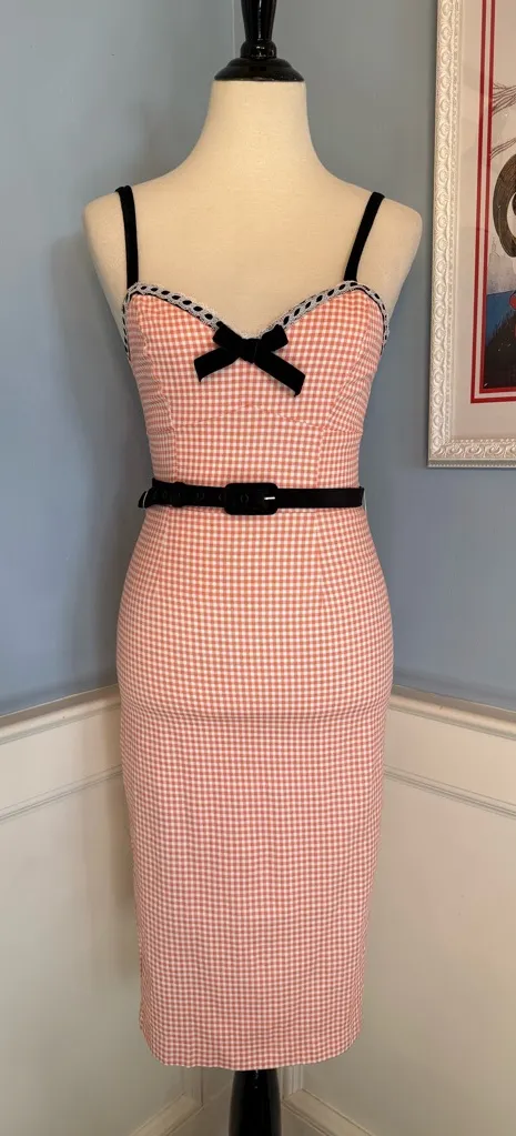 RARE! Micheline Pitt Vixen for Unique Vintage Lilli Peach Gingham Wiggle Midi Dress Sz M The Peach Gingham Lilli Midi Wiggle Pencil Dress is sassy as well as sweet! From the Unique Vintage x Micheline Pitt - Vixen by Micheline Pitt collection this is a fabulous wiggle dress. Very hard to find - this was purchased from a store in the Netherlands. Fully lined. Velvet ribbon bow detail and adjustable straps. Fabric has some stretch. Shown on a size 8 mannequin. See actual sz M measurements in photos. Cotton, spandex #Vixen #MichelinePitt #UniqueVintage #Retro #Pinup peach gingham, wiggle dress, midi length, vintage-inspired, fitted silhouette, velvet bow, stretch fabric, adjustable straps, retro fashion, pinup style