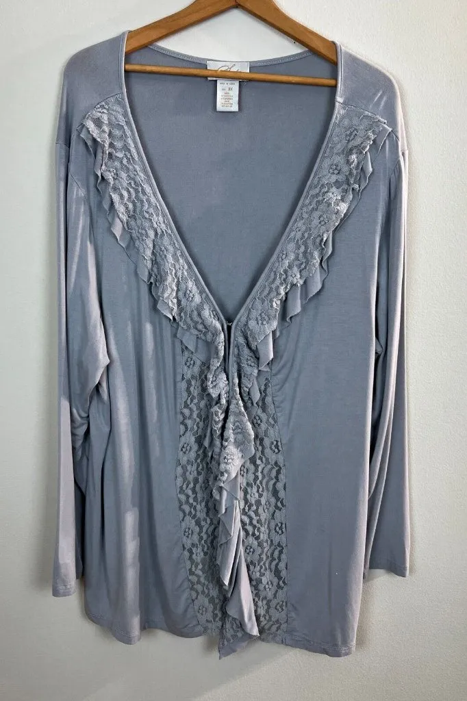 Very good condition! No rips, tears, holes or stains. Features: Lightweight knit with sheer lace trim and ruffle accent Topper / cardigan / top will need a camisole under since the front is partially open 2 hidden clasp closures Solid 2 clasp closure Style Midnight Velvet plus size 3X Viscose, spandex blend - machine wash Underarm to underarm: 26.75 in Length (shoulder to hem): 27.5 in