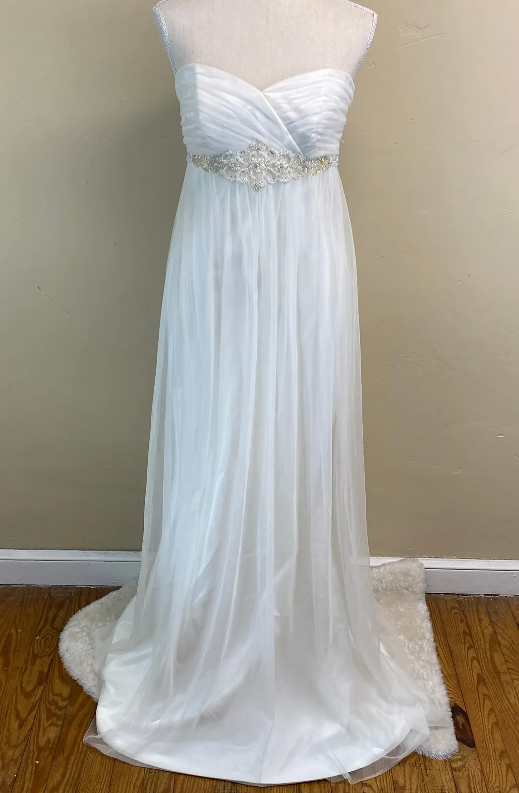 This is a beautiful Grecian Style dress with sweetheart neckline, boning in chest, empire waist, low back with zip closure, and floor length trail. There is a beautiful hand beaded/embroidered silver/white/beige belt. The dress is in good condition but there are some marks along the bottom and a tear in the belt on the back. Size 10. I am open to offers. Approximate flat measurements: Bust: 14" Waist: 13.5" Length: 56" and train is longer