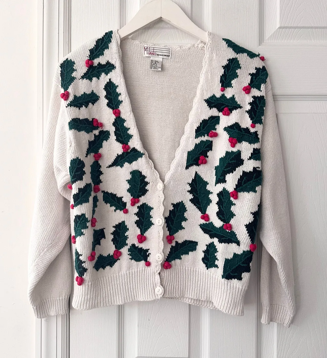 Size small from Milano Design Group. Vintage. Made in Hong Kong. Ramie cotton blend. V neck cardigan with embroidered holly berries and leaves throughout. Built in shoulder pads (one is slightly loose). Preowned with some signs of wear throughout. In otherwise good condition. Measurements: approximate All items come from a smoke free/pet free home. No trades or modeling. As always, offers are welcome. Thanks for stopping by!