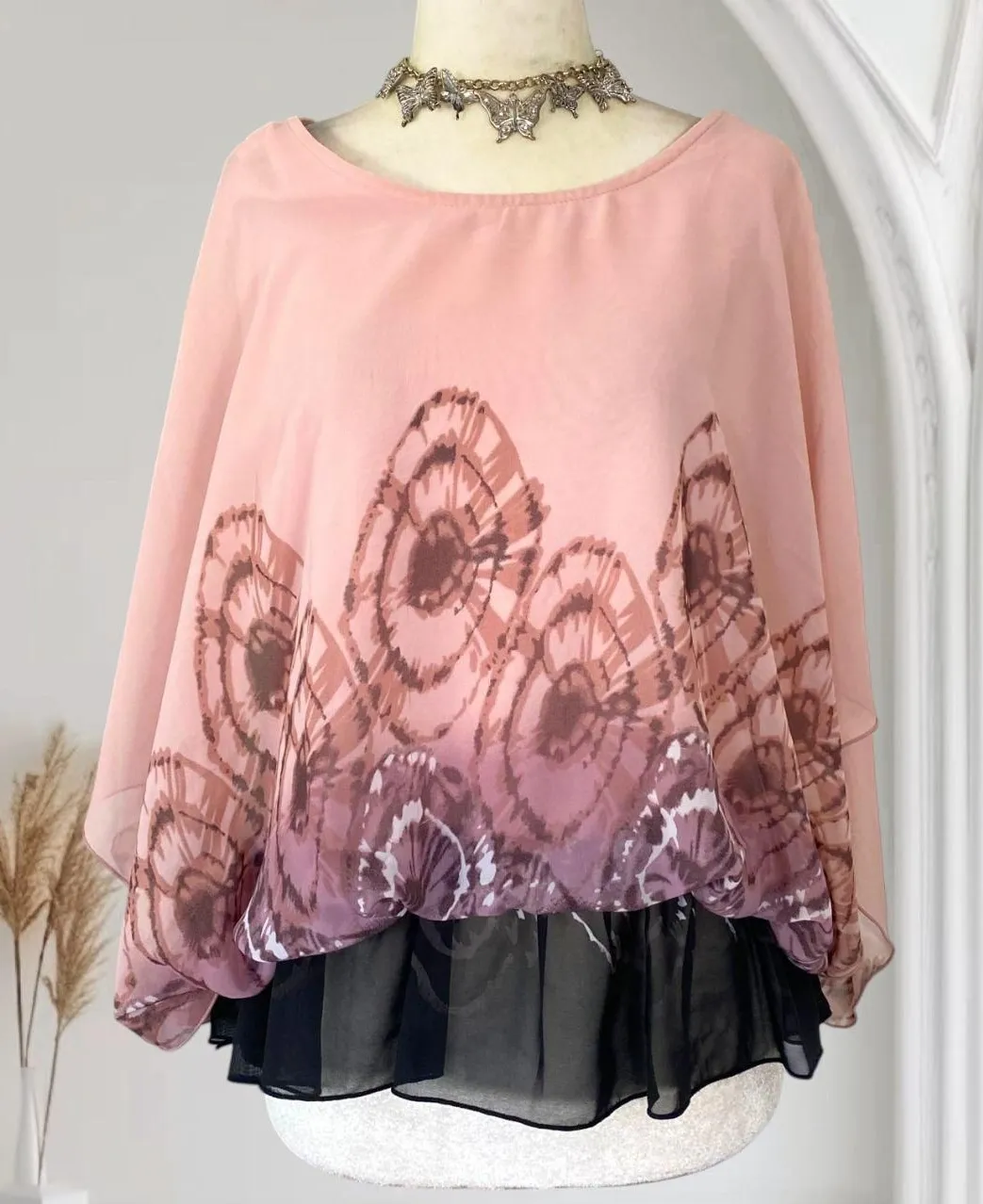 🥀 Whimsygoth Bat Sleeve Shawl Top 🥀 ༓ Brand: Milano ༓ Size L ༓ stunning mesh top, light pink black tie dye swirl design ༓ short wide oversized bat sleeves, tank top underneath ༓ such a romantic goth boho whimsygoth piece Tags: #witchy #goth #whimsygoth #gothic #boho