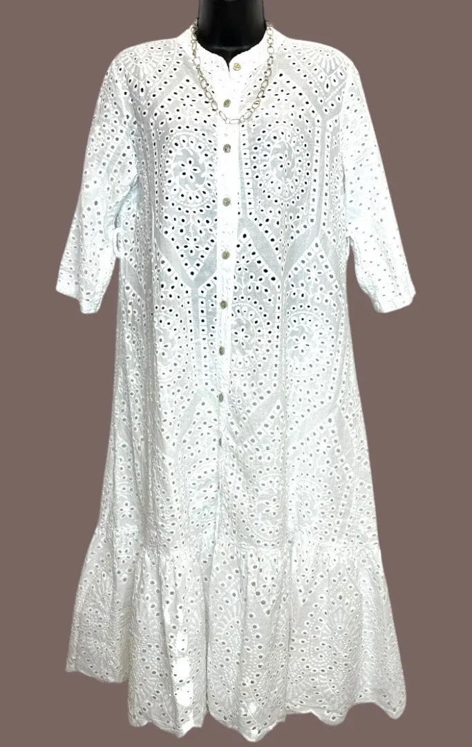Milio Milano Women's White boho Eyelet 100% cotton Dress Size Small Brand new without tags. MSRP: $162. No belt/sash included. 3/4 Sleeve can be rolled up. *The white spots on the dress is from the lighting, the dress has no stains/flaws as it is brand new* This dress is perfect as a swimsuit cover up, or open as a vest/coat. The dress is unlined, button down with a ruffle at hem. Sleeves can be worn rolled up or down 3/4. Measurements are APPROXIMATE and were taken laying flat: Size: SMALL Length: 45" Sleeve length: 16" (unrolled) Waist: 40" Pit to pit: 20" Shoulder to shoulder: 15.5" Materials: 100% Cotton