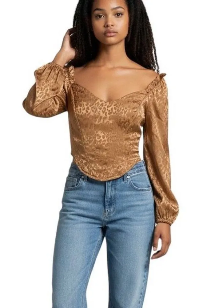 Milk & Honey Satin Corset Top Womens XL Long Sleeve Leopard Print Smocked Blouse Gold - $13 New With Tags - From T