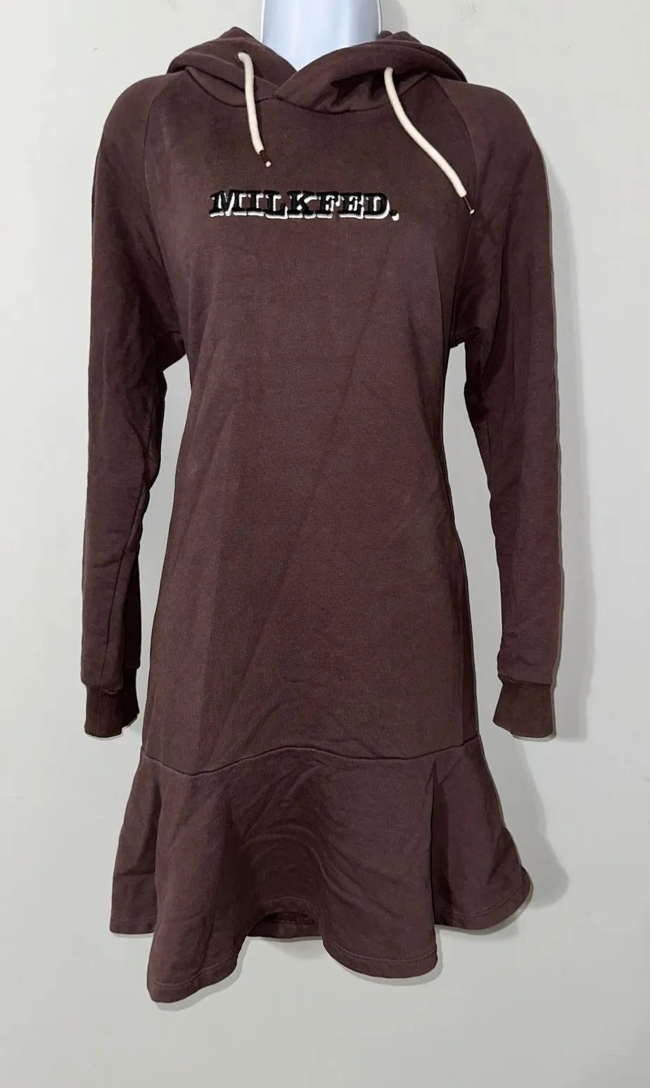 Style: T-Shirt Dress, Sweater Dress, A-Line, Casual Dress Length: Short Color: Brown Department: Women Sleeve Length: Long Sleeve Pattern: Solid Occasion: Casual Material: Cotton Blend, Cotton, Polyester, Spandex Neckline: Round Neck Character: Casual Chic, Comfort, Streetwear Fabric Type: Knit Keywords: hoodie dress, sweatshirt dress, long sleeve dress, brown dress, casual dress, MILKFED dress, women's dress, size S, ruffle hem dress, hooded dress, comfortable dress, stylish dress, loungewear dress All pre owned clothing will be cleaned according to care instructions with unscented detergent. All items stored in polybags Comes from a smoke free home