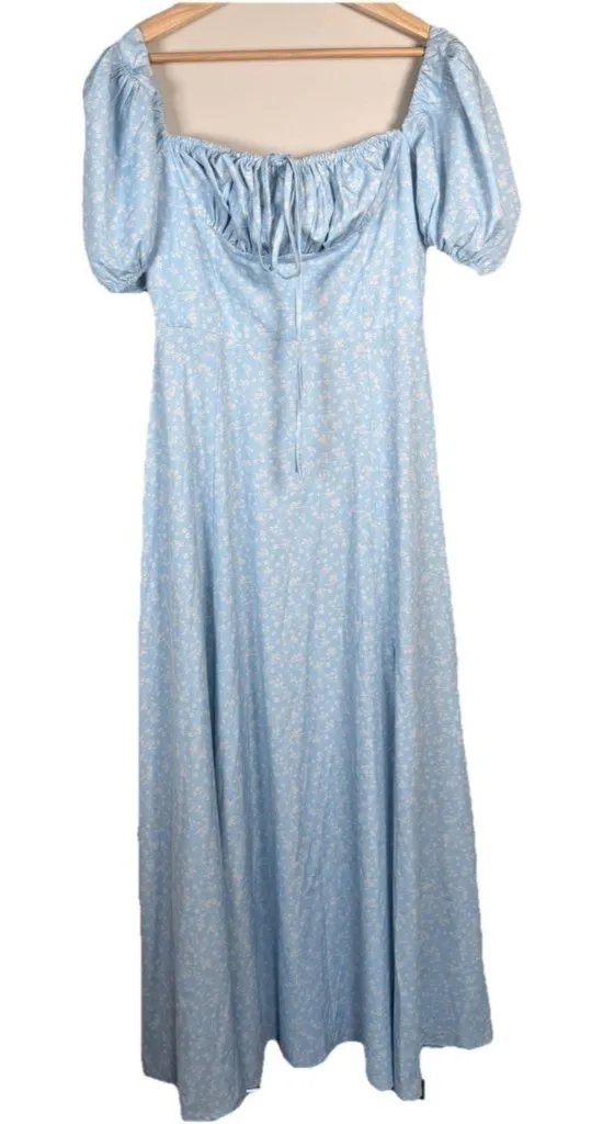 The Tallulah Blue White Floral Midi Dress by Kutumai in size M exudes a charming cottagecore aesthetic with its floral pattern and bohemian theme. The dress features short sleeves and a midi length, making it suitable for various occasions such as weddings, parties, or casual outings. The blue and white color combination adds a touch of whimsy to the design, perfect for summer, fall, and spring seasons. This regular fit dress is ideal for women looking for a peasant-inspired, flowery, and boho chic style. Cottagecore dress Milkmaid dress Feminine