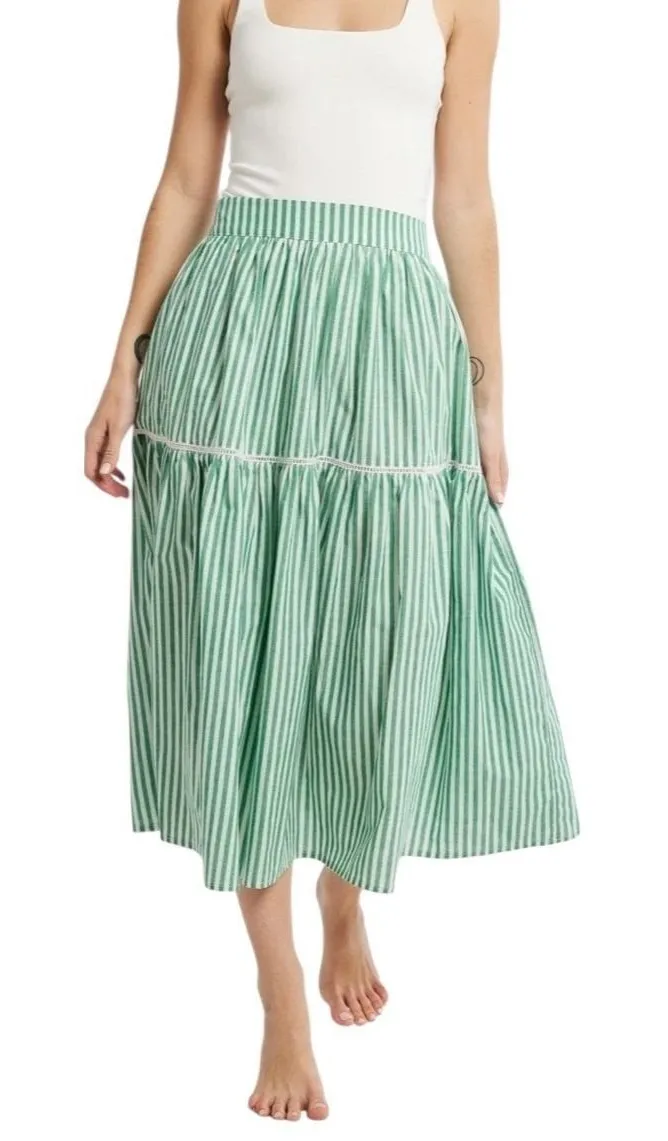 Pre-owned. No flaws. Smoke free home. Waist 17.6'' Length 37'' Mille Resort Travel green and white striped tiered maxi skirt. waistband with decorative button details. Tiered design with subtle white trim. Full flowing silhouette. Type: Skirt Style: Maxi Skirt Length: Long Department: Women Material: Cotton Pattern: Striped Fabric Type: Cotton Closure: Button Garment Care: Dry Clean Only Country of Origin: India Keywords: Mille skirt, striped skirt, tiered skirt, maxi skirt, resort wear, travel skirt, boho skirt, casual skirt, summer skirt, cotton skirt, plus size skirt, lilly pulitzer