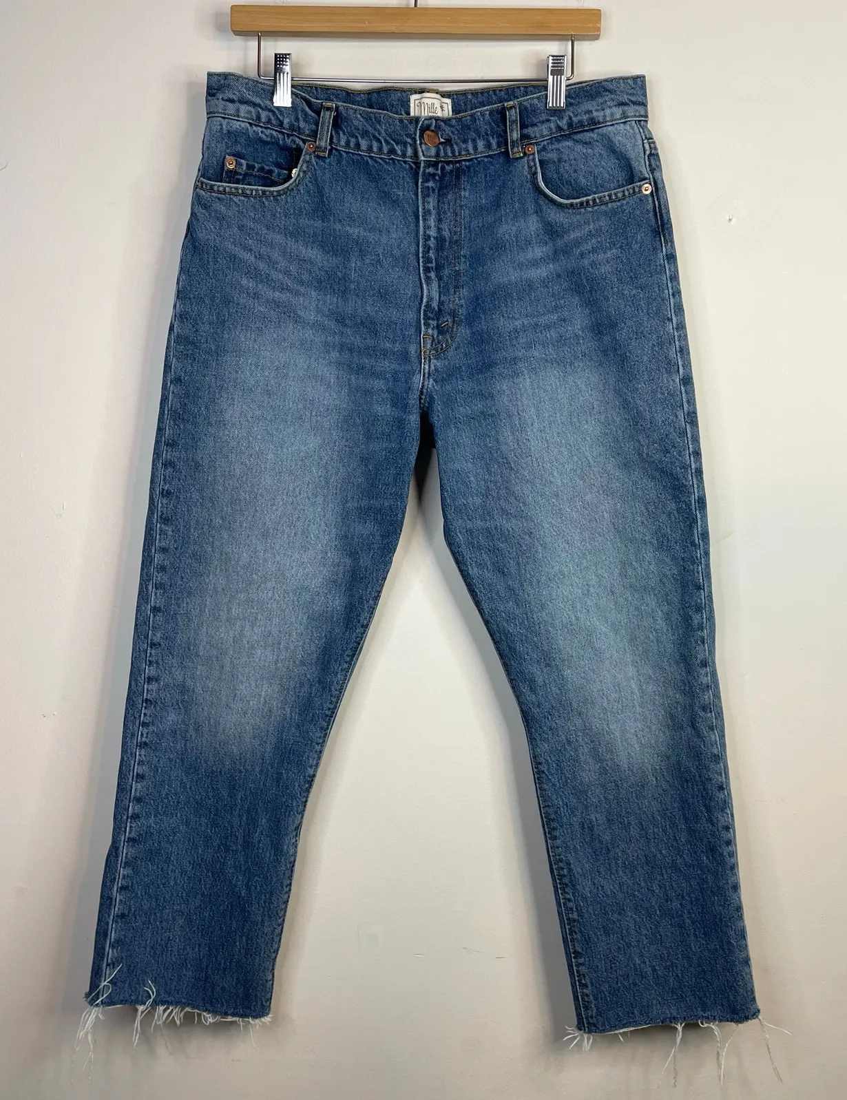 Mille Brooke Mid Rise jeans, women’s size 33. In good pre-owned condition. 100% cotton denim- these may be snug at first but will stretch out with wear. Medium blue wash with factory fade and whiskering. Tiny bit of wear inside left thigh. Front button closure with zip fly and five pocket design. Higher mid rise, slim fit through hips. Legs are straight, ankle length with a raw edge frayed hem. Waist: a bit under 17” across Rise: 12.5” Inseam: 27” Bottom hems: 8” across All measurements are approximate and were taken with the garment laid flat Smoke free home with pets Ladies classic comfy fall winter spring summer