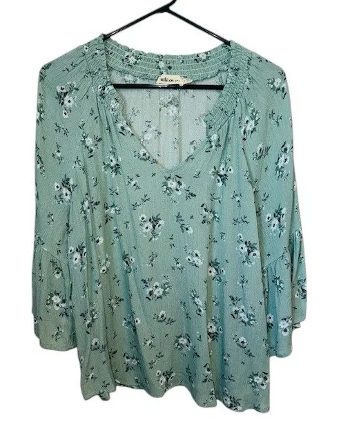 Whispers of spring come alive in this charming floral blouse. A delicate dance of white and dark green blossoms cascade across a soft green backdrop, creating a look that's both fresh and feminine. The flattering V-neckline is framed by a smocked collar, adding a touch of texture and comfort. Three-quarter bell sleeves add a playful, bohemian flair, making this top a standout piece. Perfect for a casual brunch with friends, a garden party, or a relaxed day at the office. Approximate Flat Lay Measurements: Pit to pit = 21" Length = 26" Color: Green Type: Blouse Department: Women Neckline: V-Neck Sleeve Length: 3/4 Sleeve Sleeve Type: Bell Sleeve Pattern: Floral Accents: Ruffle Features: Smocked, Lightweight, Breathable, Easy Care Fit: Regular Keywords: floral blouse, bell sleeve top, smocked blouse, v neck blouse, green floral top, bohemian blouse, casual blouse, womens top, millibon, floral print, three quarter sleeve, spring blouse, summer blouse