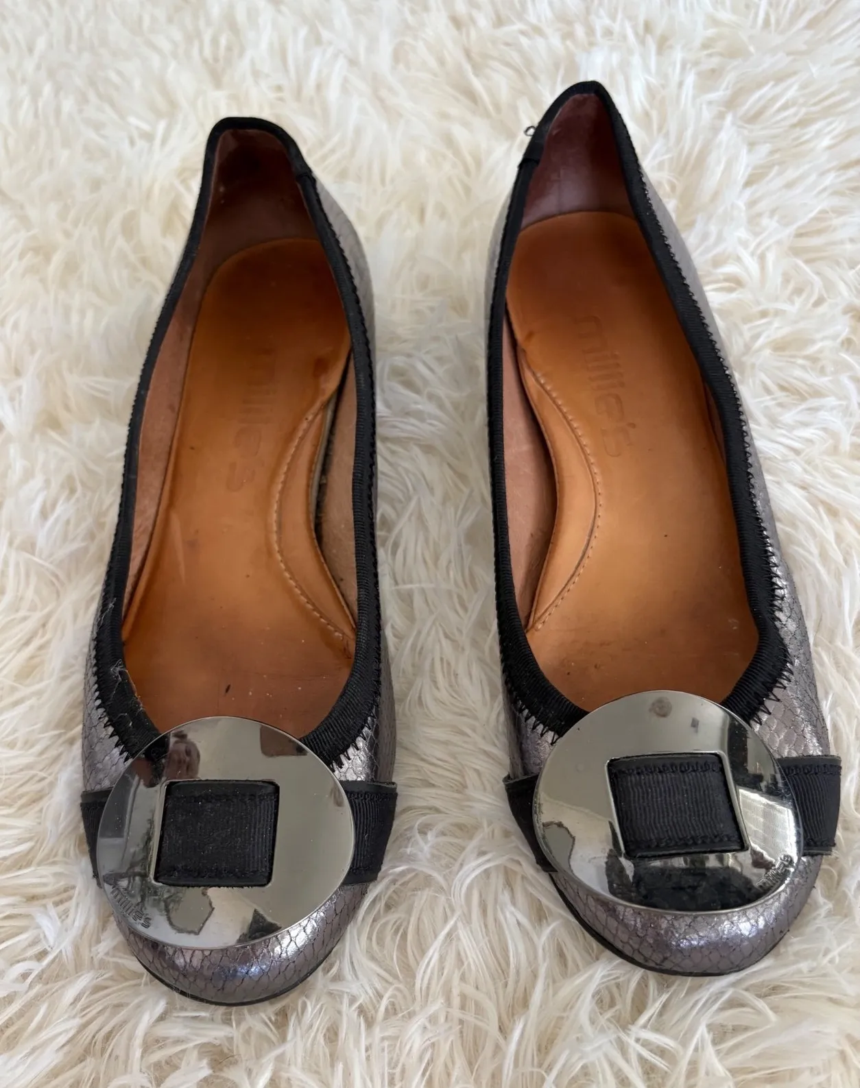 Statement ballet flats add a touch of refined edge to any ensemble. These Millie's flats feature a shimmering silver snakeskin print, creating a texture that's both sophisticated and subtly daring. A bold, black square buckle adorns the toe, adding a modern, geometric contrast against the organic pattern of the shoe. The low heel and sleek silhouette offer all-day comfort and versatility. These flats are perfect for adding a touch of glam to your office attire, elevating a casual weekend look, or complementing a chic cocktail party outfit. Style: Ballet Color: Silver Department: Women Upper Material: Leather Features: Buckle, Comfort, Lightweight, Padded, Lined Occasion: Casual, Party/Cocktail, Business, Workwear Closure: Slip On Lining Material: Leather Outsole Material: Rubber EU Shoe Size: 40 Type: Flat Model: Square Buckle Ballet Keywords: Millies flats, silver ballet flats, snake print shoes, square buckle flats, womens flats, casual flats, dress flats, silver shoes, animal print shoes, metallic flats, designer flats, comfortable flats, low heel flats, black and silver shoes