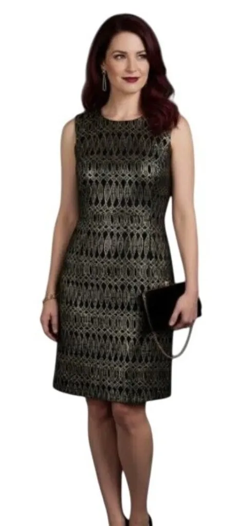 Sophisticated sleeveless mini dress featuring a tailored fit with geometric black and gold metallic... Show more