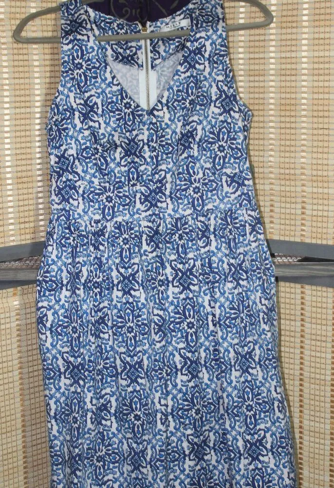 MILLY for Desgin Nation blue and white mosaic print, sleeveless fit and flare dress ends just above the knee. This Capri Italia size 8 dress measures at 29” bust, 35.25” length (approx.) Using a unique unaligned vertical vertical panel style, the fabric print enhances the mosaic tile appearance. A flattering v-neck into a breast pleated bodice allows a comfortable bust, then a princess seam starts the fitted belthing of darts that extends approx 2"to the waist seam to mark the pleats that flair the lower half of the dress. The dress features a long line goold-colored vertical zipper closure. Fabric: 98% Cotton with 2% spandex allowing for a touch of stretch. Care: Machine wash cold, gentle cycle. Tumble dry on low heat and warm iron if needed.