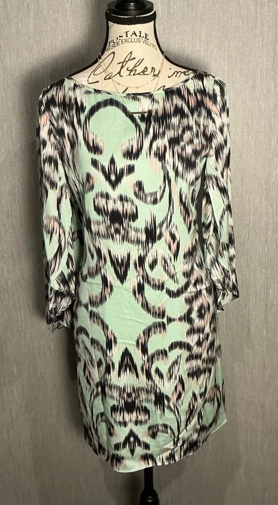 Stylish long sleeve dress by Milly. Features a bold mint and black pattern. Perfect for any occasion. If you have an issues or concerns with your purchase please reach out and let me know. I’ll do whatever I can to make it right. Customer satisfaction is at the forefront of my small business and I want you to love your purchase. By purchasing you are supporting a small business and buying second hand is a great way to reduce waste and take care of our environment. All items are washed and put into cellophane bags to ensure cleanliness. Please reach out with any questions!