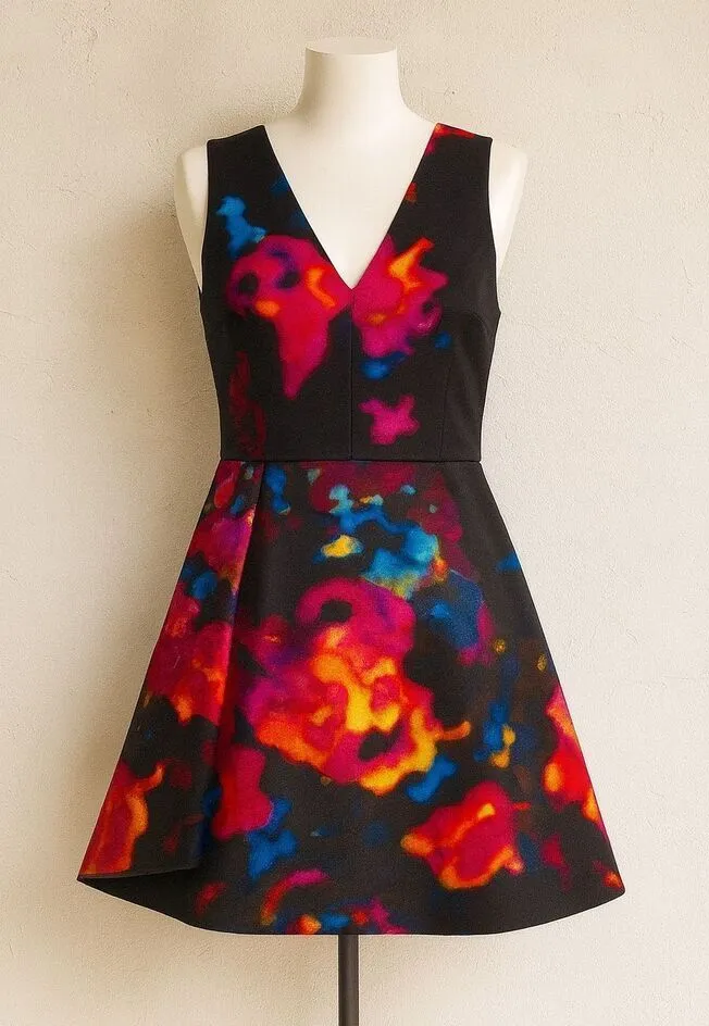 Milly Multicolor Abstract Print A-Line Mini Dress Women’s Size XS V-Neck Fit & Flare Turn heads in this vibrant Milly A-line mini dress featuring a bold multicolor abstract print on a sleek black background. Designed with a flattering fit-and-flare silhouette, pleated skirt, and deep V-neckline, this piece blends playful energy with sophisticated style. Perfect for cocktail parties, date nights, or chic daytime events. Features / Highlights Brand: Milly Style: A-Line Fit & Flare Mini Dress Color: Black with Multicolor Print Fabric: 50% Cotton, 45% Viscose, 5% Elastane; Lining: 100% Polyester Neckline: V-Neck Closure: Exposed Zip at Back Details: Pleated Accents, Sleeveless, Structured Skirt Size: Women’s XS (US 2) Measurements (approx.): Bust 29.5” | Waist 26” | Hip 34” | Length 35” Condition: Excellent pre-owned condition #MillyNY #CocktailDress #FitAndFlare #PartyStyle #DesignerChic