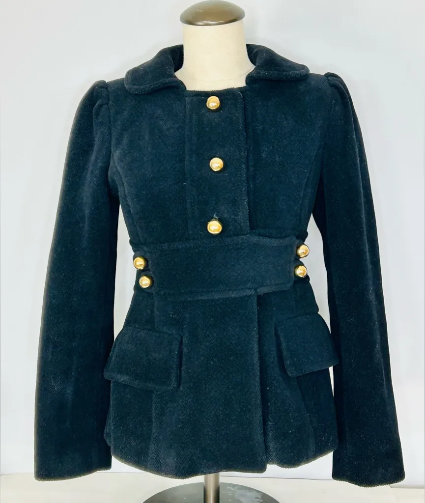 Black wool blend peacoat with 4 snapfront buttons. Structured fit with waist-accentuating black panels that button across the front and the back. Popping structured shoulders with pleating details. The silhouette of this jacket with those additional panels and the lifted shoulders will give your waist a snatched fit. Approx 17” across pit to pit and 25” shoulder to hem. No flaws noted.