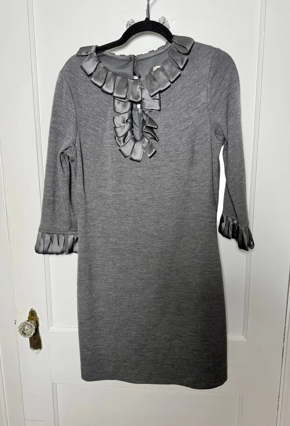 Excellent condition - no snags, holes, or stains Classic, preppy, Y2K style Gray sheath dress Short length and slightly fitted shape Silk ruffles at the sleeve and neckline 3/4 length sleeves Smoke free pet friendly home All offers are welcome Ships quick Approximate measurements Pit to pit 18.5" Length 37" career, office, work, polished, business, classic, closet staple, designer, high end, quiet luxury, gossip girl, city, statement